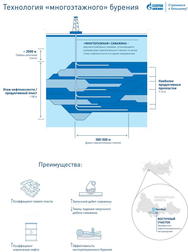 «Технология «многоэтажного» бурения будет востребована, так как создает высокий потенциал для дополнительной прибыли и не требует существенных дополнительных затрат»,— отметил генеральный директор «Газпромнефть-Оренбурга» Ирек Хабипов.