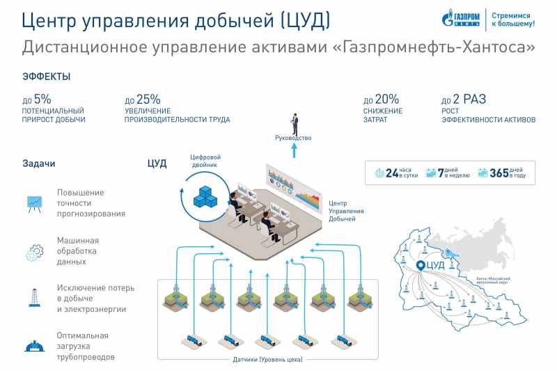 Новые программные продукты являются ключевыми элементами цифрового двойника южной лицензионной территории Приобского месторождения. Интегрированная цифровая платформа позволяет отслеживать все параметры работы оборудования и определять оптимальные режимы его загрузки. Контроль за инновационной цифровой системой ведется из Центра управления добычей (ЦУД) «Газпромнефть-Хантоса», созданного ровно год назад — в конце 2017 года. ЦУД является частью программы «Актив будущего» , направленной на цифровую трансформацию добывающих активов «Газпром нефти».