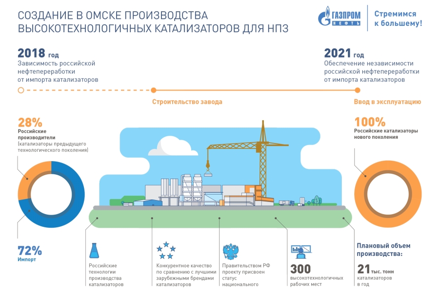 Масштабное катализаторное производство «Газпром нефти» спроектировано по принципу полного технологического цикла. Оно обеспечит выпуск 21 тыс. тонн катализаторов в год и гарантирует независимость нефтеперерабатывающей отрасли от зарубежных поставщиков. Планируется, что строительство комплекса завершится в 2021 году. Создание катализаторного производства в Омске поддержано специальным инвестиционным контрактом с Министерством промышленности и торговли РФ и правительством региона. Министерством энергетики РФ проекту «Газпром нефти» присвоен статус национального.