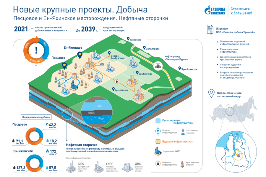 Начало разработки нефтяных оторочек Песцового и Ен-Яхинского месторождений запланировано на конец 2021 года. Объем добычи на данных участках ожидается до 2 млн тонн н.э. в год. Опыт работы на этих активах позволит опробовать передовые технологии и открыть новые возможности по освоению запасов нефтяных оторочек нефтегазоконденсатных месторождений.