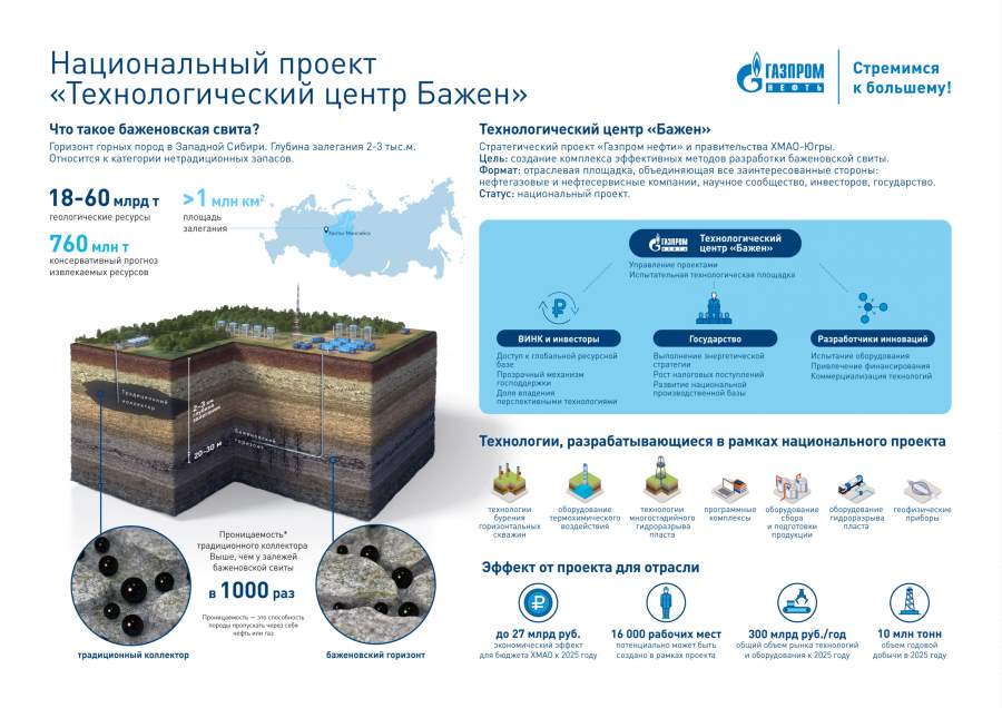 Технологический центр «Бажен» (дочернее общество «Газпром нефти») первым в России провел 18-стадийный гидроразрыв пласта (ГРП) в интервале баженовской свиты. Высокотехнологичный ГРП и увеличение длины горизонтального ствола позволили удвоить приток нефти со скважины.