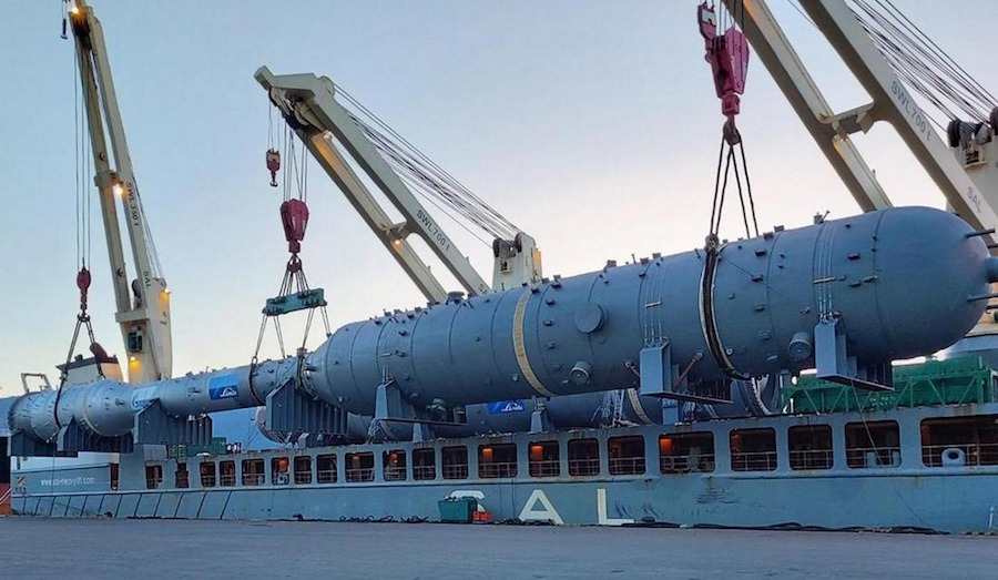 Из Республики Корея морское судно направилось в порт Де-Кастри Хабаровского края. Там каждая колонна будет перегружена на отдельную речную баржу и при помощи буксиров направлена по рекам Амур и Зея к причалу Амурского ГПЗ в районе г. Свободного.