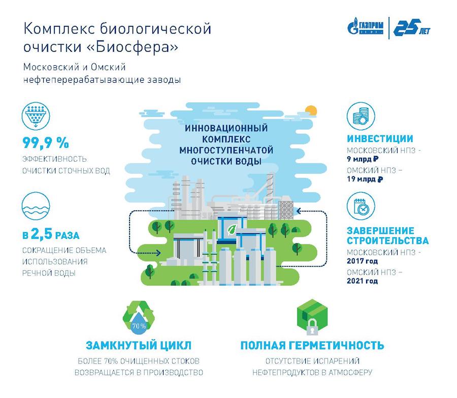 «Биосфера»» повысит эффективность очистки воды до 99,9%, благодаря чему Омский НПЗ сможет перейти на практически замкнутый цикл водопотребления, снизив нагрузку на городские очистные сооружения. Уникальный природоохранный проект «Биосфера» входит в масштабную программу развития ОНПЗ и включен в комплексный план федерального проекта «Чистый воздух» нацпроекта «Экология». Инвестиции компании в проект составляют 19 млрд рублей. Строительные работы планируется завершить в 2021 году.
