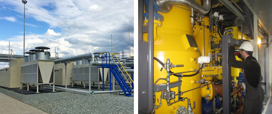 Все установки оснащены узлом осушки газа, действующим в режиме рекуперации температуры. Для этого в линию нагнетания интегрированы охладитель и подогреватель, которые образуют промежуточный контур и последовательно осуществляют охлаждение газа, отбой и удаление конденсата, подогрев газа. Осушенное таким образом топливо подается в турбины с температурой на 20°C выше точки росы.