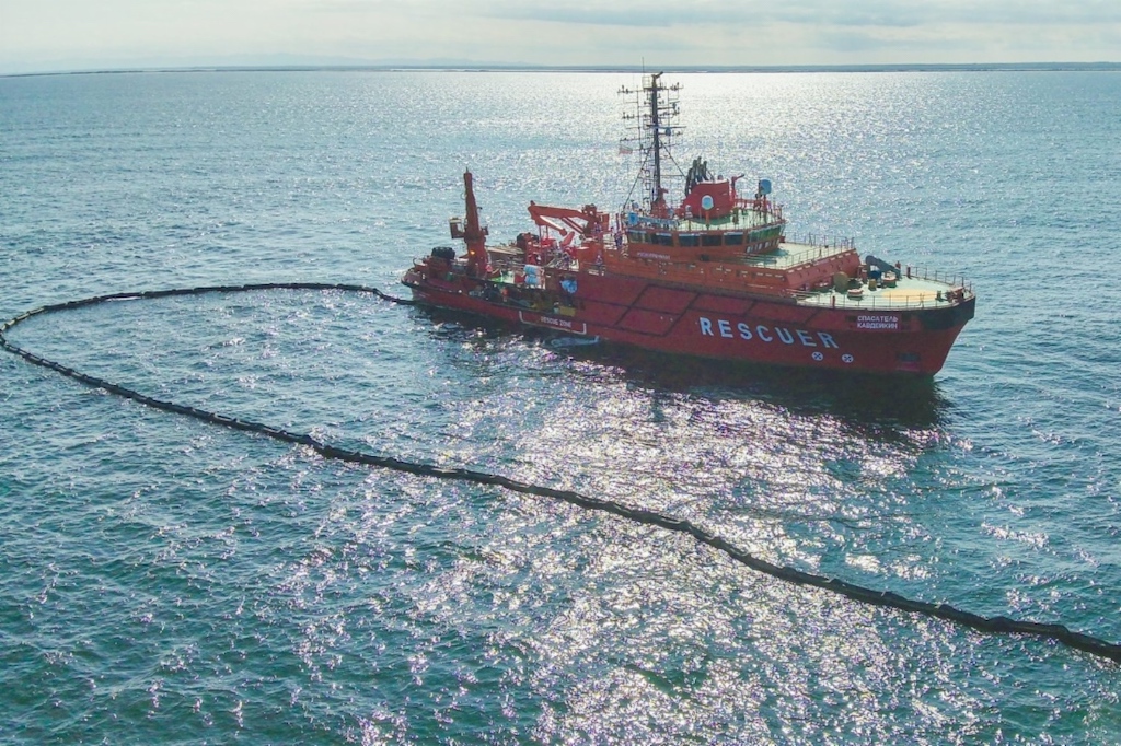 Спасательное судно «Спасатель Кавдейкин» «Морспасслужбы» с установленным боновым ордером