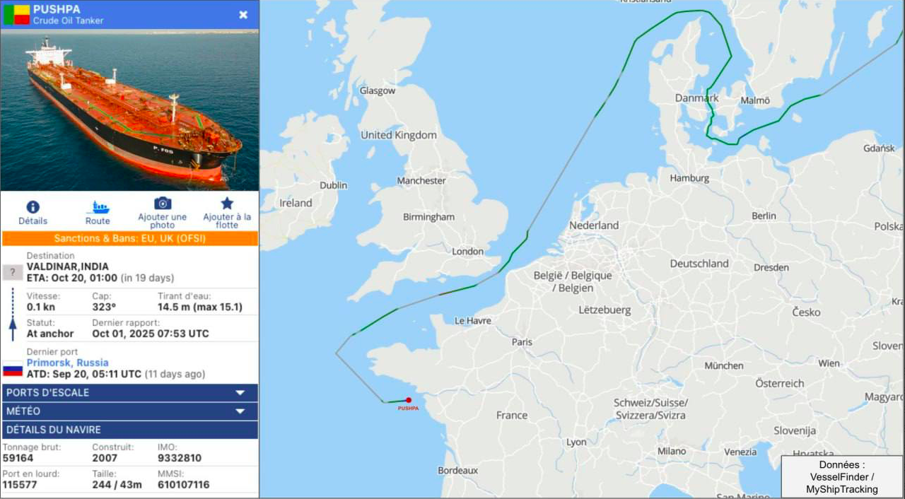 Согласно данным MarineTraffic, танкер с сырой нефтью вышел из российского порта Приморск 20 сентября. Конечный пункт назначения - Индия. Танкер проследовал через Балтику, Северное море и Ла-Манш. 28 сентября французский военный корабль перехватил танкер в нейтральных водах и сопроводил его в порт Сен-Назер.