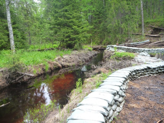 Проведены берегоукрепительные работы в виде двух заградительных дамб-плотин из мешков с песком (более 2000) для исключения попадания нефтепродукта в реку в период дождей.