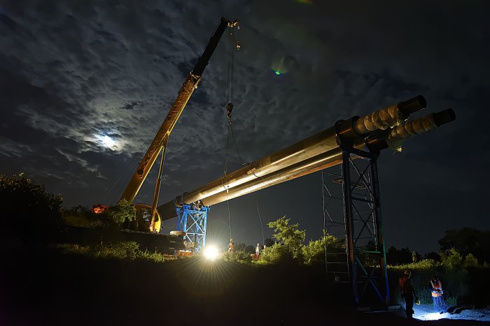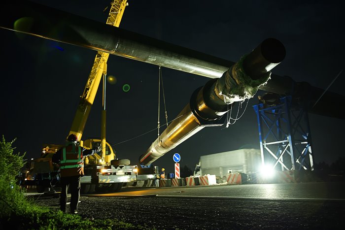 Готовиться к завершающему этапу «переброски» 42-метрового участка магистрального трубопровода монтажники начали еще за два часа до начала работ. К 24.00 участок шоссе по Крылова, над которым на опорах уже возвышалась ранее смонтированная половина трубопровода, был закрыт для движения.