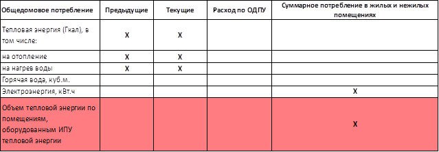 В-третьих, в таблице «Показания ОДПУ» появилась строка, где указан объем тепловой энергии по всем помещениям, оборудованным ИПУ тепловой энергии (6). Именно эти данные используются для определения «расчетного норматива по ИПУ тепловой энергии» (способ расчета №7).