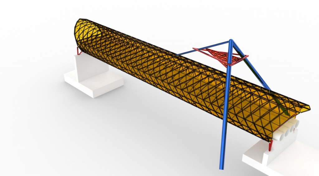 Конструкция моста почти полностью изготовлена на заводе. Над футлярами сначала возведут металлический каркас, который затем покроют закаленным стеклом триплекс. Визуально мост будет похож на гигантскую стеклянную трубу.