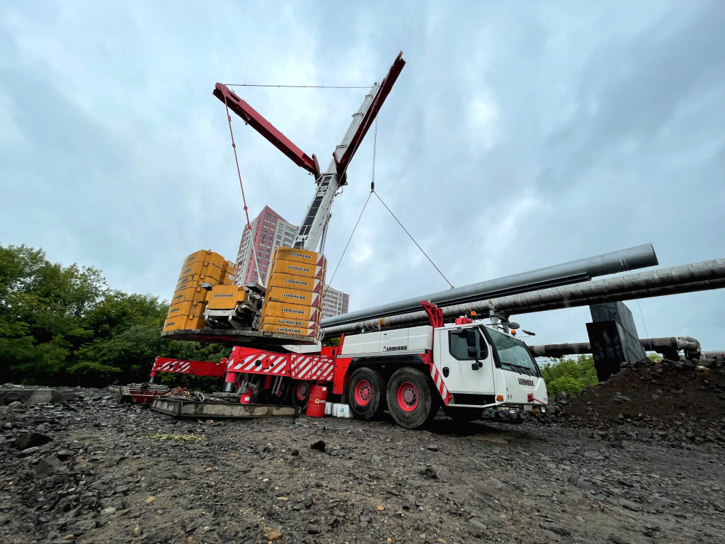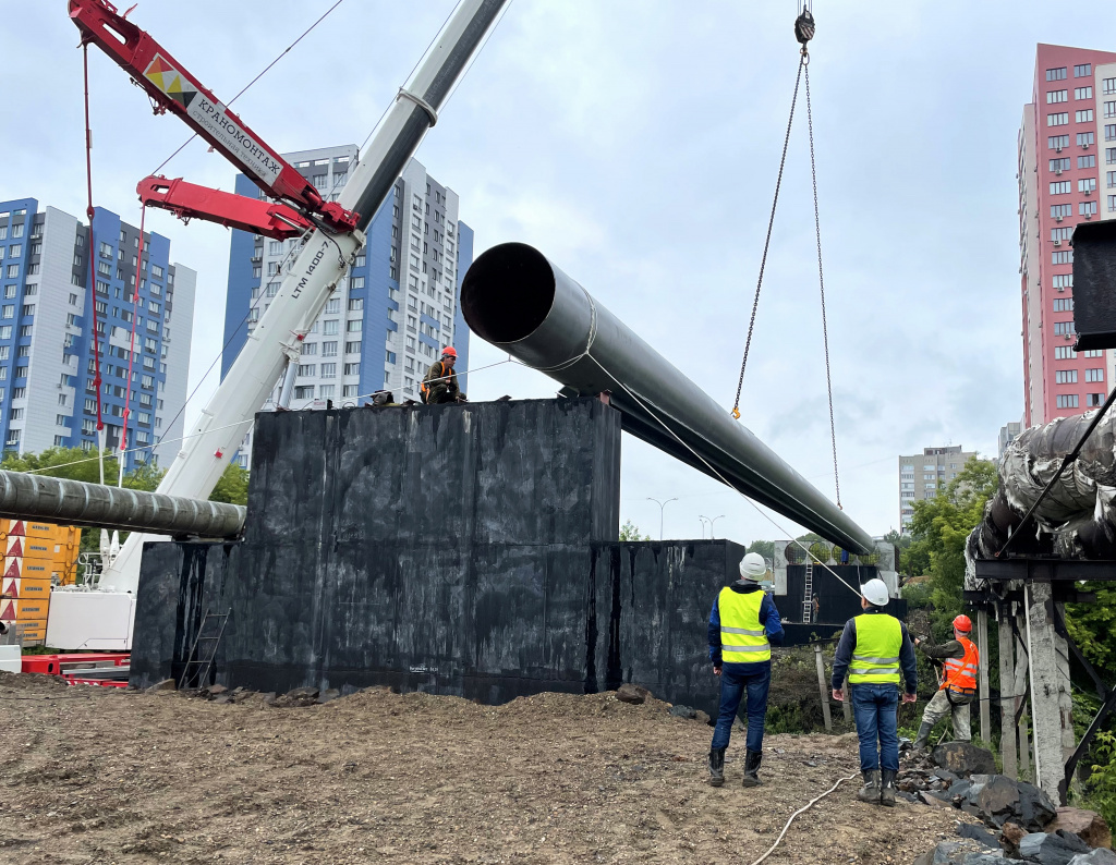 Для монтажа футляров СГК разработала настоящую спецоперацию. Из-за стесненных условий на берегу реки два подъемных крана для установки крупногабаритных конструкций — вес каждого футляра 34 тонны, длина 53 метра — использовать было невозможно.