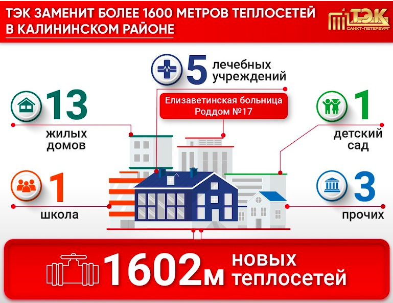 После окончания работ от нового трубопровода запитают 23 здания, в том числе 13 жилых домов. Теплее и комфортнее станет в квартирах 12 000 петербуржцев. От тепломагистрали также зависит надежность теплоснабжения социальных учреждений, работа которых важна для района и всего города. Бесперебойное отопление и горячее водоснабжение получат детское учреждение, школа, детская и взрослая поликлиники, СПб ГБУЗ «Родильный дом №17», СПб ГБУЗ «Елизаветинская больница» и СПб ГКУЗ хоспис №4.