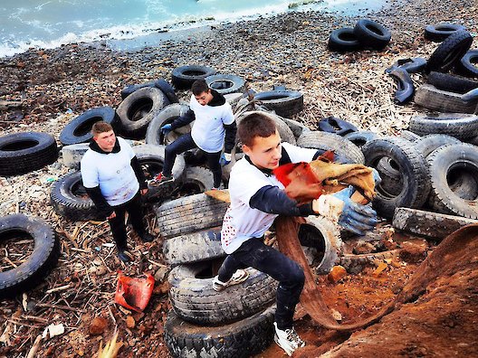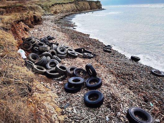 Целую гору старых шин от грузовых автомобилей убрали с побережья Татарского пролива волонтёры Сахалинского горного техникума и Восточной горнорудной компании после того, как увидели информацию в СМИ о надвигающейся экологической катастрофе.