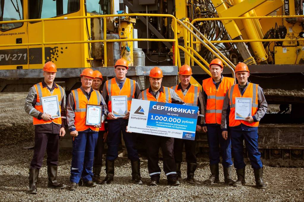 Бригада рекордсменов «КРУ-Взрывпром» работает на высокопроизводительном буровом станке PV-271. Всего в общей сложности в августе они пробурили 3 941 буровзрывную скважину средней глубиной около 16 метров. В том числе был установлен и суточный рекорд: за смену 19 августа бригадир Александр Аверин и машинист Сергей Семенов пробурили 1 610 погонных метров, что является максимальным показателем за весь период работы на этом станке в компании.